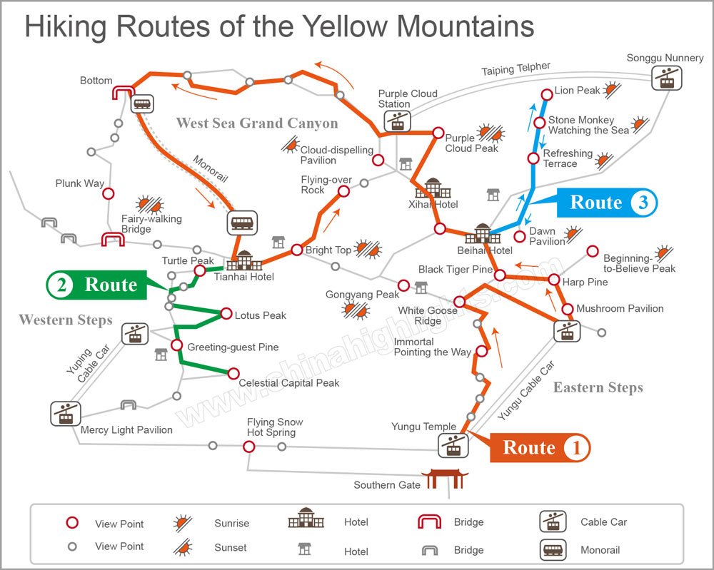 Le chemin classique pour aller aux montagnes est de d’abord se rendre à la ville de Huangshan par bus, train ou avion. Le trajet en bus prend environ 1 heure de la ville jusqu’à l’aire panoramique de Huangshan.