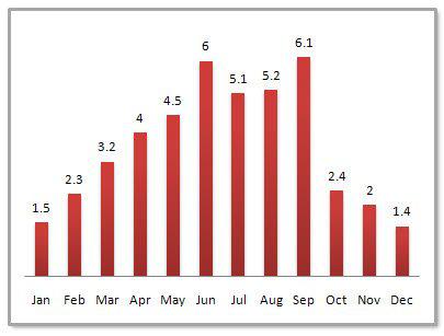 Toutefois, les températures n'atteignent jamais des valeurs extrêmes. Au cours du mois de juillet, considéré comme le plus chaud de l'année, la moyenne haute des températures avoisine les 32 °C. Inversement, le mois de janvier reste le plus froid avec une moyenne basse des températures de 1°C.
