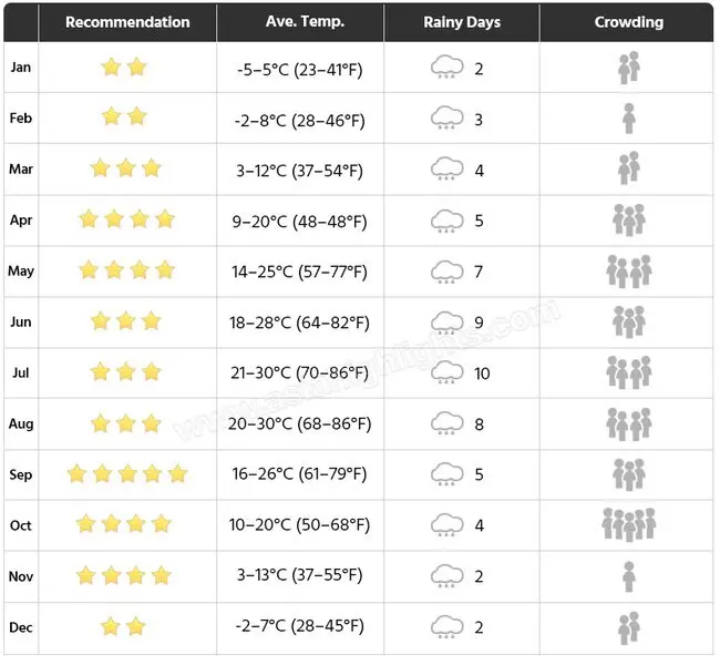 Au printemps et en automne, la température est entre 20 et 30 degrés, pas comme l'été chaud ni comme l'hiver froid, ce n'est pas non plus la saison des pluies et des typhons et autres mauvais temps. Par conséquent, ces deux saisons sont les meilleures périodes pour voyager en Chine. Plus précisément, l'automne (septembre-octobre) est le meilleur, suivi du printemps (avril-mai).